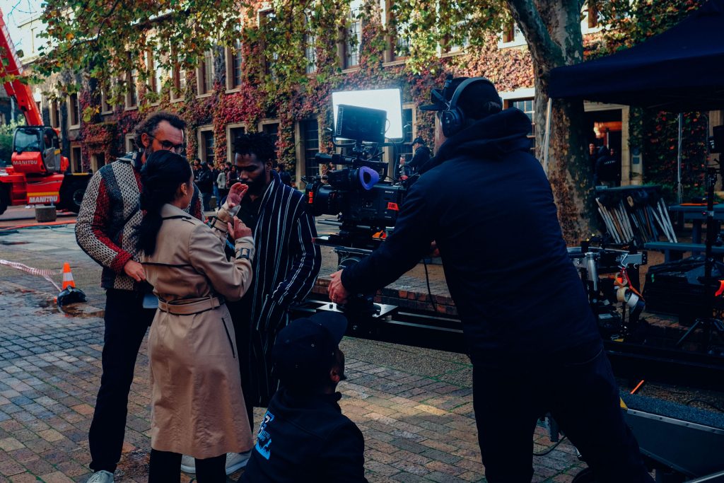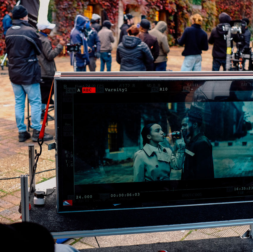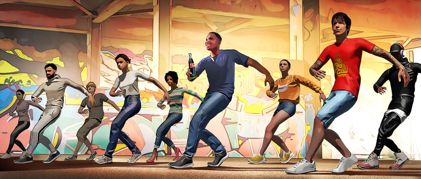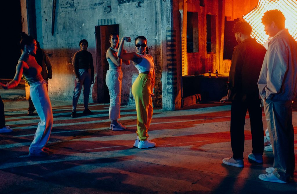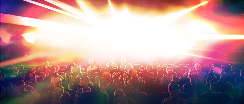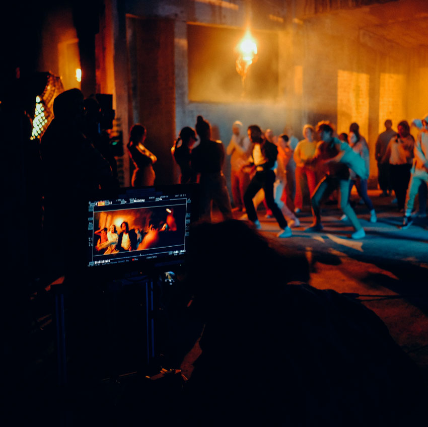 The film opens in a theater, with the camera positioned above our hero who is comfortably seated. As he pops a popcorn into his mouth, the camera swiftly flies at the speed of light into the popcorn itself. The interior of the popcorn absorbs the light from the cinema projector, and this color palette seamlessly transitions into the next scene, a vibrant dance battle. The camera pierces through the dancers, revealing our hero, who appears happily surprised to find himself in this new setting.