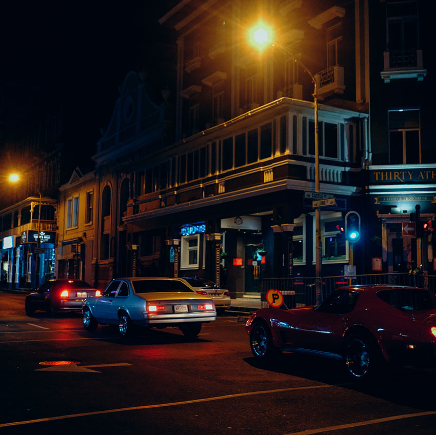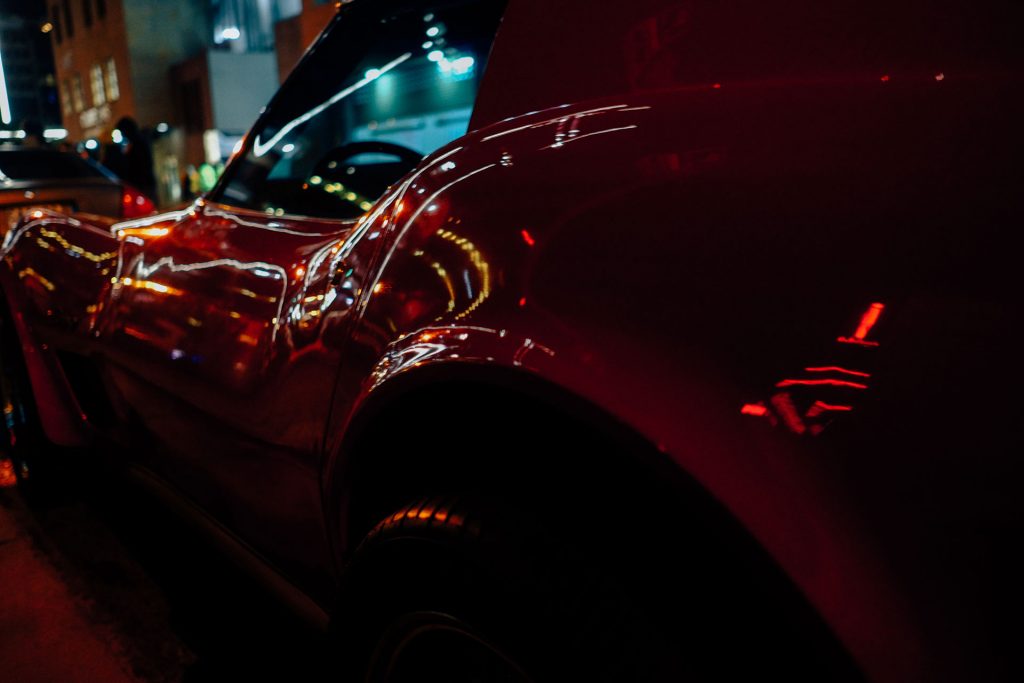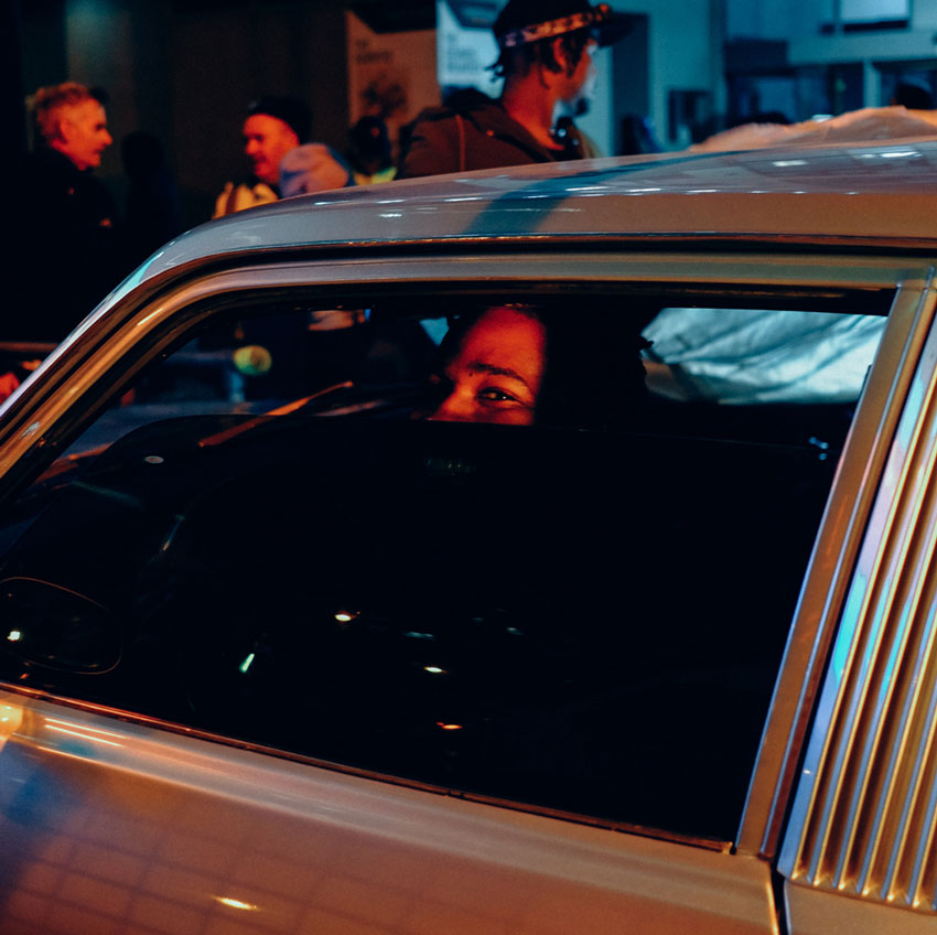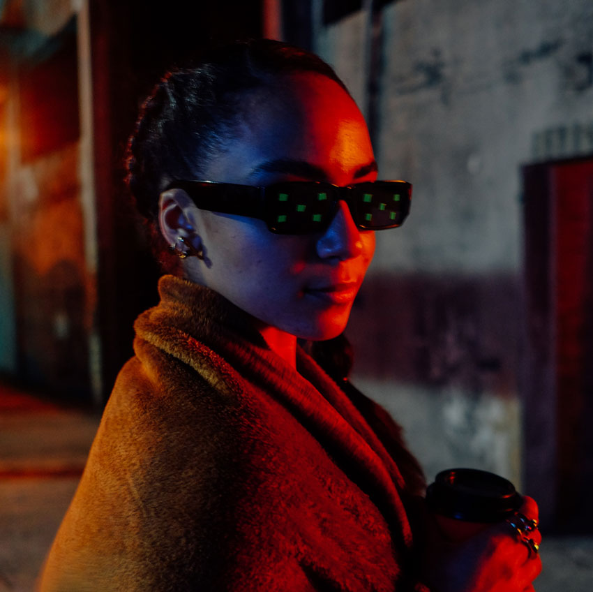 As we transition from the dance battle scene, our focus shifts to the competing girl, a character who will play a crucial role in the film. Her sunglasses reflect the surrounding lights of the festive dance battle scene, and the camera follows the reflections, entering the scene they reveal: a thrilling car chase. With a matching forward camera movement, we are instantly immersed in the heart of the chase.